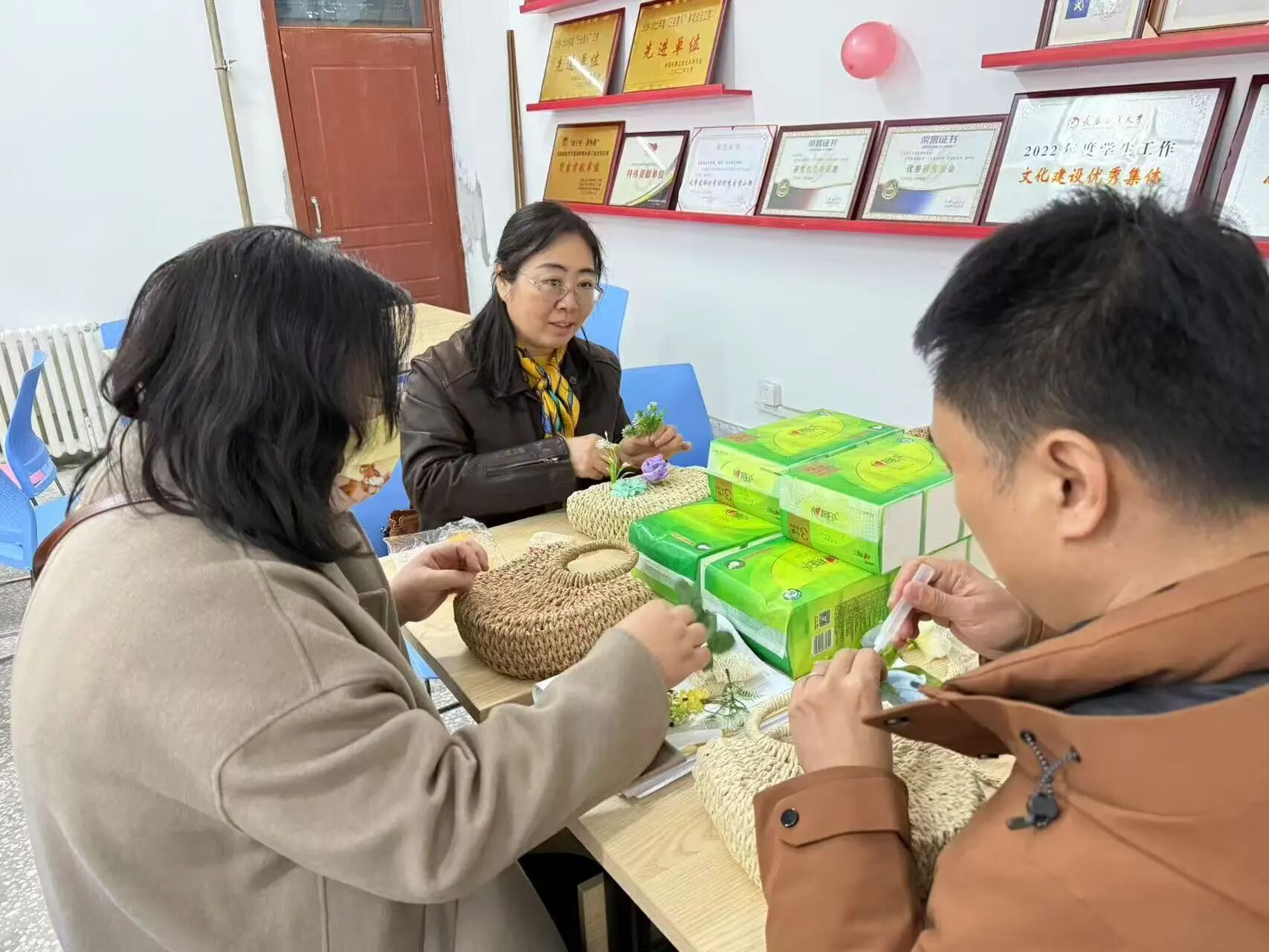 制作环节中,教职工们充分展现出对美的独特理解与追求。有人用仿真花制作出娇艳花束,粘贴在包身,仿佛将整个春天都收纳其中;有人用彩色丝带编制俏皮蝴蝶结作为点缀,让草编包增添了几分灵动;还有人用珠子和亮片拼出个性图案,创意满满。现场欢声笑语不断,大家一边动手制作,一边交流心得,氛围轻松融洽。