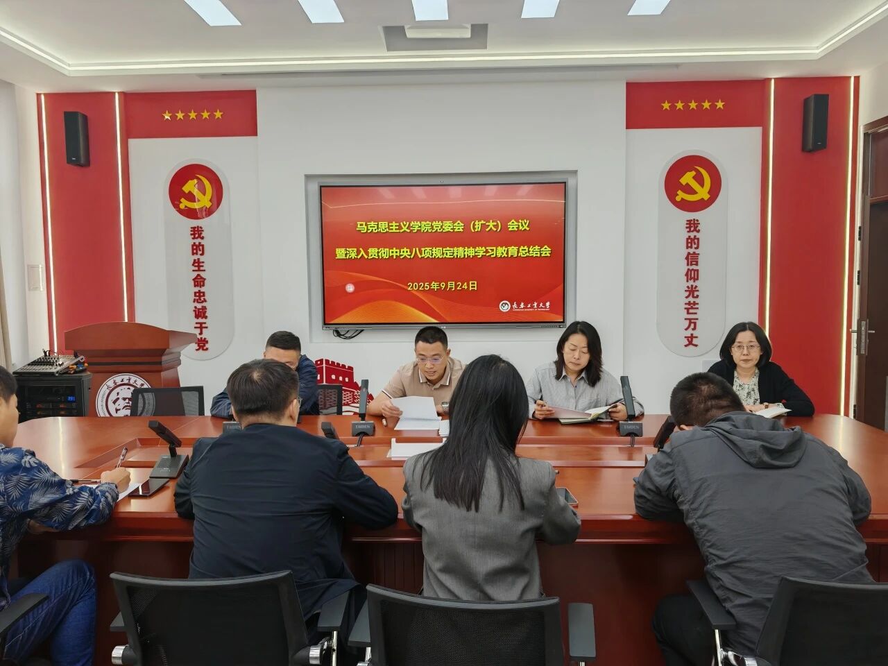 召开党委会(扩大)会议暨深入贯彻中央八项规定精神学习教育总结会。党委书记钟旭主持会议,对学院学习教育取得的经验成效进行全面总结并讲话;院长兼党委副书记于浚湜传达了习近平总书记关于深入贯彻中央八项规定精神学习教育的重要指示精神和中央党的建设工作领导小组会议精神;副院长王晓光传达了省委、学校党的建设工作领导小组会议精神;副院长高博传达了《中共长春工业大学委员会关于建立健全作风建设长效机制的工作方案》。